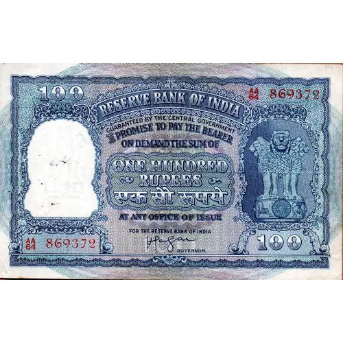 Obverse lettering RESERVE BANK OF INDIA GUARANTEED BY THE CENTRAL GOVERNMENT I PROMISE TO PAY THE BEARER ON DEMAND THE SUM OF ONE HUNDRED RUPEES EK SOU ROOPAYE AT THE OFFICE OF ISSUE FOR THE RESERVE BANK OF INDIA (SIGNATURE) GOVERNOR