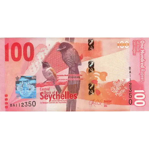 Central Bank of Seychelles / Labank Santral Sesel / La Banque Centrale des Seychelles One Hundred Rupees / San Roupi / Cent Roupies Seychelles Black Paradise Flycatcher / Gobe-mouche noir de paradis des Seychelles |