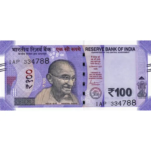 | Obverse lettering | RESERVE BANK OF INDIA GUARANTEED BY THE CENTRAL GOVERNMENT I PROMISE TO PAY THE BEARER THE SUM OF ONE HUNDRED RUPEES MAHATHMA GANDHI |