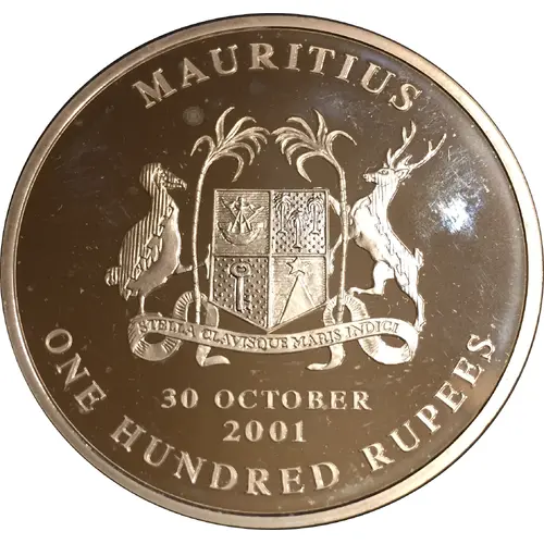 | Obverse lettering | MAURITIUS 30 OCTOBER 2001 ONE HUNDRED RUPEES |