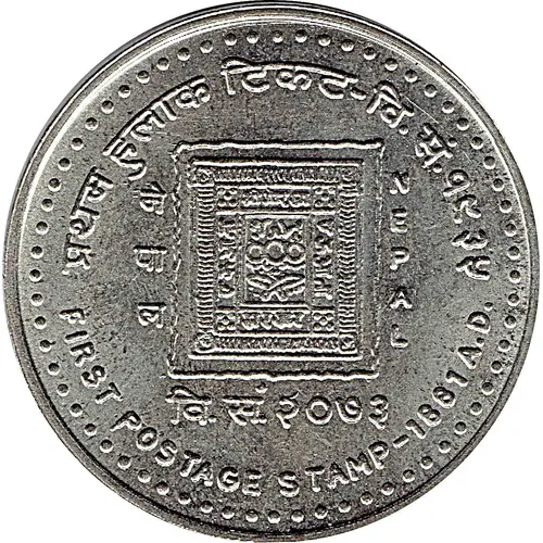 | Reverse description | Dots near rim, description of the event, value (in nepali + english), in center circle with symolized montains and stupa |