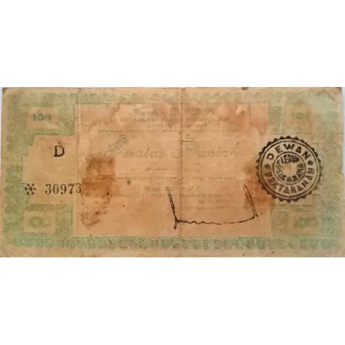 | Obverse lettering | Mandat D(ewan) P(ertahanan) D(aerah) P(alembang), ( 100 ) Seratus Rupiah, 1-8-1947 (Translation: Mandate board of defense district of Palembang, 100 Rupiah, 1-8-1947) |