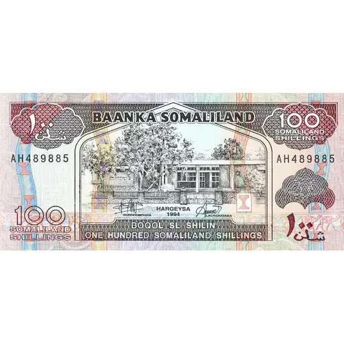 | Arka yüz lejandı | BANKAA SOMALILAND BOQOL SL SHILIN ONE HUNDRED SOMALILAND SHILLINGS ١٠٠شن (Translation: Bank of Somaliland One Hundred Somaliland Shillings.) |