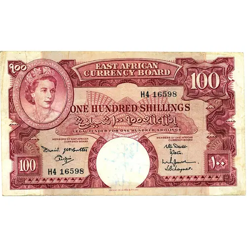 | Obverse lettering | EAST AFRICAN CURRENCY BOARD ONE HUNDRED SHILLINGS |