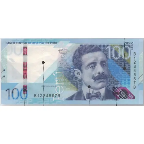 | Надписи лицевой стороны | BANCO CENTRAL DE RESERVA DEL PERÚ CIEN SOLES 100 100 PERÚ (turned 90º) PEDRO PAULET (Translation: Central Reserve Bank of Peru One hundred Soles 100 100 Perú (turned 90º) Pedro Paulet) |