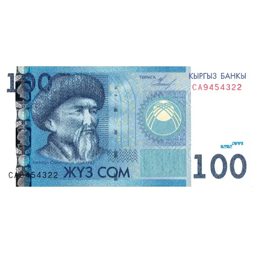 | Obverse lettering | 100 КЫРГЫЗ БАНКЫ Токтогул Сатылган 1864-1933 ЖҮЗ СОМ 100 (Translation: Kyrgyz Bank, Toqtoğul Satılğan 1864-1933, One Hundred Som) |