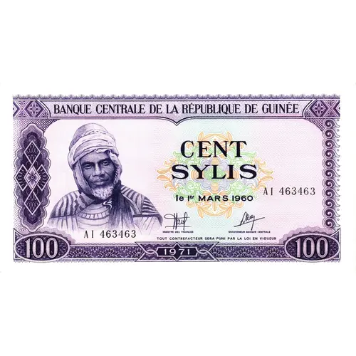 | Obverse lettering | BANQUE CENTRALE DE LA REPUBLIQUE DE GUINEE CENT SYLIS LE 1 MARS 1960 1971 |
