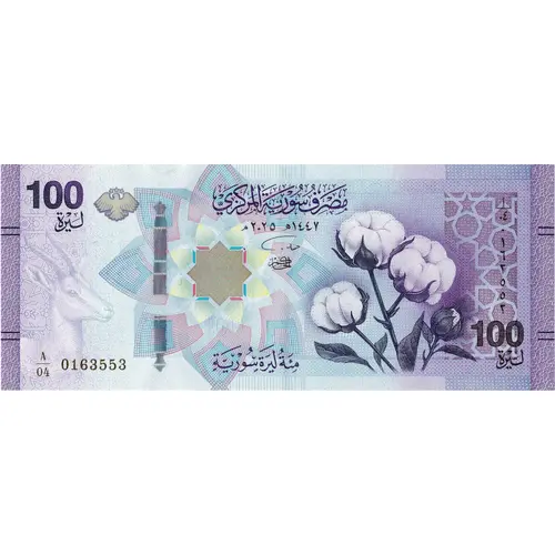 100 مصرف سورية المركزي ٢٠٢٥ 100 مائة ليرة سورية (Translation: Central Bank of Syria One Hundred Syrian Pounds) |
