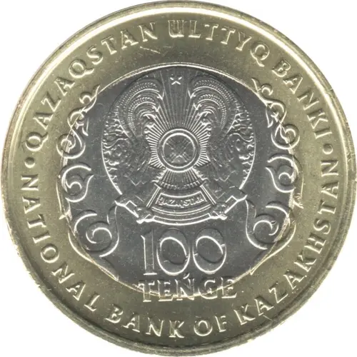 | 表面の説明 | The State Emblem of the Republic of Kazakhstan is depicted in the central part. To the left and to the right of it are elements of the national ornament. Along the circumference - the inscriptions QAZAQSTAN ULTTYQ BANKI NATIONAL BANK OF KAZAKHSTAN. At the bottom of the coin there is an inscription indicating the denomination of 100 TEŃGE. |