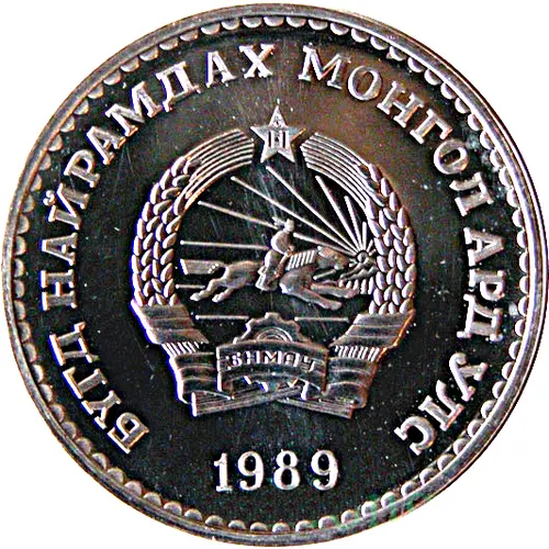 | نوشتههای روی سکه | БҮГД НАЙРАМДАХ МОНГОЛ АРД УЛС БНМАУ 1989 (Translation: The Mongolian People`s Republic) |