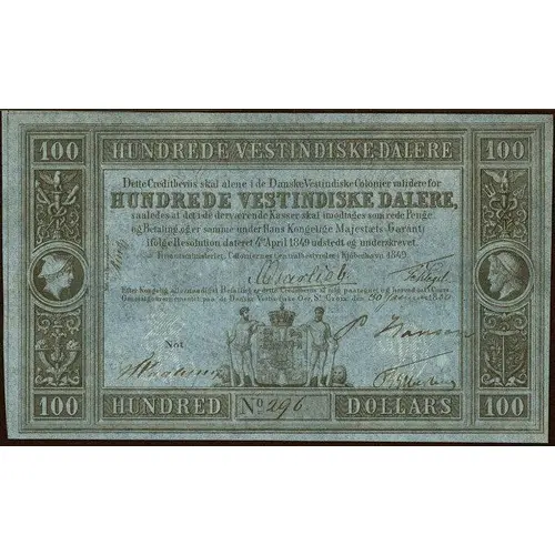 | Obverse lettering | HUNDREDE VESTINDISKE DALERE Dette Creditbeviis skal alene i de Danske Vestindiske Colonier validere for HUNDREDE VESTINDISKE DALERE, saaledes at det i de devaerende Kasser skal imodtages som rede Penge og Betaling oger samme under Hans Kongelige Majestaets. Garanti fölge Resolution daterat 4th April 1849 udstedt og underskrevet. HUNDRED DOLLARS (Translation: ONE HUNDRED WEST INDIAN DOLLARS This credit certificate must only be valid in the Danish West Indian Colonies ONE HUNDRED WEST INDIAN DOLLARS, in such a way that it must be accepted as ready money in the traveling boxes and Payment and the same under His Royal Majesty. Guarantee following Resolution dated 4th April 1849 issued and signed. HUNDRED DOLLARS) |