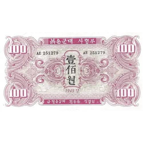 | Obverse lettering | 붉은군대 사령부 壹 佰 원 1945년 금전출남의 환용은 정법임 (Translation: Red Army Command, One Hundred Won, Year 1945, The exchange of money is a legal act) |