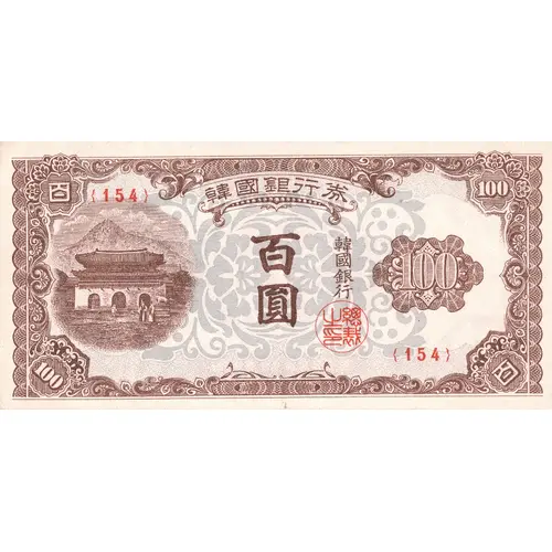 (Translation: Korean banknote, 100 Won, Bank of Korea)