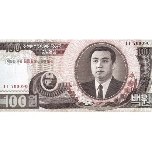 | Obverse lettering | 조선민주주의인민공화국 중앙은행 위대한 수령 김일성동지 탄생 95돐 100원 백원 (Translation: Democratic People`s Republic of Korea The Central Bank, Great Leader Comrade Kim Il -sung`s 95th birthday, One Hundred Won) |