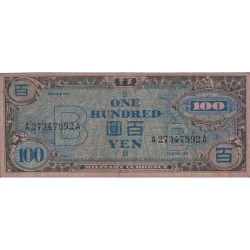| Obverse lettering | 百 軍票 SERIES 100 B 100 ONE HUNDRED A 27347992 A 圓 百 YEN A 27347992 A B SERIES 100 100 百 MILITARY CURRENCY (Translation: 100 Military currency 100 yen 100) |