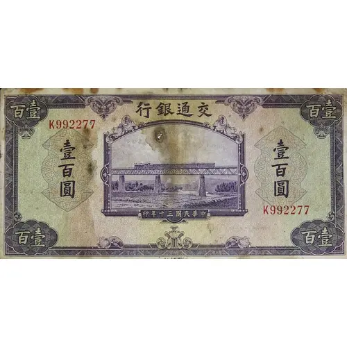 | Obverse lettering | 行銀通交 壹 百 圓 印年十三國民華中 (Translation: Bank of Communications One Hundre Yuan Printed in the 30th year of the Republic) |