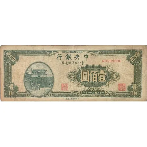| Obverse lettering | 行銀央中 券通流省九北東 圓佰壹 印年四十三國民華中 廠海上廠製印央中 (Translation: The Central Bank of China Circulation notes in northeastern 9 provinces 100 Yuan Printed in the 34th year of the Republic of China Central Engraving and Printing Plant, Shanghai Factory) |