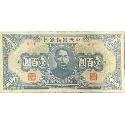 | Obverse lettering | 中央儲備銀行 壹百圓 中華民國國幣壹百圓 中華民國三十二年印 (Translation: Central Reserve Bank of China 100 Yuan 100 Yuan national currency of the Republic of China Printed in the 32nd year of the Republic of China) |