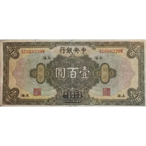 | Reverse lettering | THE CENTRAL BANK OF CHINA PROMISES TO PAY THE BEARER ON DEMAND AT ITS OFFICE HERE ONE HUNDRED DOLLARS NATIONAL CURRENCY SHANGHAI 1928 AMERICAN BANK NOTE COMPANY |