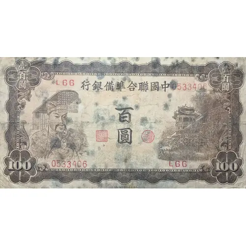 | Obverse lettering | 行銀備準合聯國中 百 圓 100 100 |