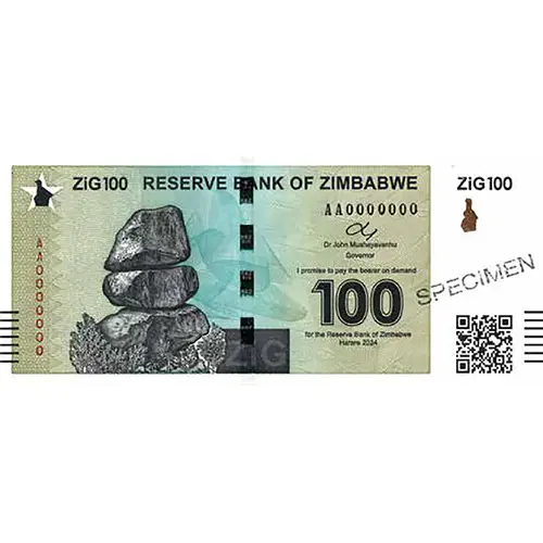 ZiG100 RESERVE BANK OF ZIMBAWE ZiG100 I promise to pay the bearer on demand 100 for the Reserve bank of Zimbabwe Harare 2024 |