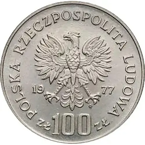 | Obverse lettering | POLSKA RZECZPOSPOLITA LUDOWA 19 77 mw ZŁ 100 ZŁ |
