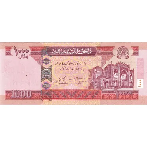 | Reverse lettering | ١٠٠٠ Da Afghanistan Bank 1000 1000 Afghanis ١٠٠٠ افغَانی (Translation: 1000. Bank of Afghanistan. 1000 Afghanis.) |