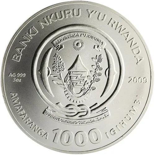 | Legenda do anverso | BANKI NKURU Y`U RWANDA Ag 999 3 oz 2009 REPUBLIKA Y`U RWANDA UBUMWE - UMURIMO - GUKUNDA IGIHUGU AMAFARANGA 1000 IGIHUMBI (Translation: Central Bank of Rwanda. Republic of Rwanda. Unity, work, patriotism. One thousand francs.) |