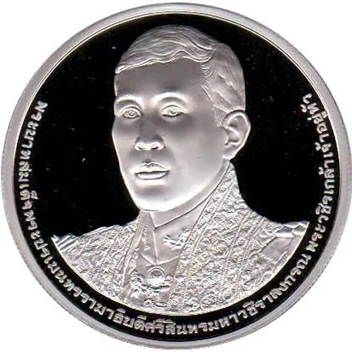 | Reverse description | Emblem of Royal ceremony of 72nd birthday of Rama X: crowned `วปร` monogram on octagonal diamond surrounded by 72 small diamonds, under the Great Crown of Victory superimposed on the Royal Nine-Tiered Umbrella, flanked by seven-tiered Chatra parasols held by Rajasiha facing right on the left and Gajasiha facing left on the right, two Nagas flanking Thai numerals `๗๒`, the creatures binded with ribbon with inscriptions `พระราชพิธีมหามงคลเฉลิมพระชนมพรรษา ๖ รอบ ๒๘ กรกฎาคม ๒๕๖๗` inside, decorated by Schoutenia glomerata flowers. Inscriptions surrounded. |