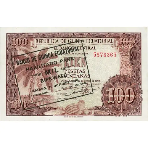 | Obverse lettering | REPUBLICA DE GUINEA ECUATORIAL EL BANCO CENTRAL PAGARÁ AL PORTADOR CIEN PESETAS GUINEANAS SANTA ISABEL, 12 DE OCTUBRE DE 1969 BANCO DE GUINEA ECUATORIAL HABILITADO PARA MIL BIPKWELE MALABO, 21 OCTUBRE 1980 (Translation: Republic of Equatorial Guinea The Central Bank pay to bearer One Hundred Pesetas Guineanas Santa Isabel, October 12, 1969 Bank of Equatorial Guinea Valid for One Thousand Bipkwele) |