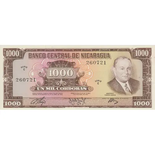 BANCO CENTRAL DE NICARAGUA Ciudad de Managua UN MIL CORDOBAS (Translation: CENTRAL BANK OF NICARAGUA City of Managua ONE THOUSAND CORDOBAS) |