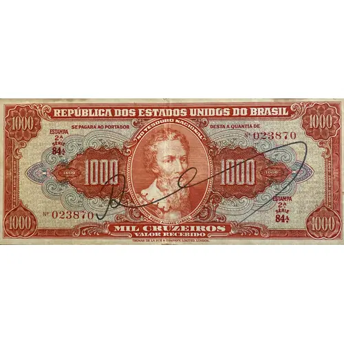 | Obverse description | Orange on polychrome, in chalcography and offset. In the center, oval medallion with the figure of Pedro Alvares Cabral (1467/68-1520), discoverer of Brazil. Above couplet `REPÚBLICA DOS ESTADOS UNIDOS DO BRASIL` (Republic of the United States of Brazil), surmounting the words `SE PAGARÁ AO PORTADOR DESTA A QUANTIA DE` (will pay to the bearer of the amount). Below the inscription `MIL CRUZEIROS / VALOR RECEBIDO` (One Thousand Cruzeiros / Amount Received). On the left, print number, serial number (above) and the sequence number (below). On the right, the sequence number (above) and print number, serial number (below). Diagonally on any note, the anonymous autograph official responsible for conference. |
