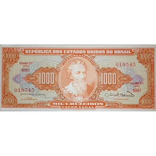 | Obverse description | Orange on polychrome, in chalcography and offset. In the center, oval medallion with the figure of Pedro Alvares Cabral (1467/68-1520), discoverer of Brazil. Above couplet `REPÚBLICA DOS ESTADOS UNIDOS DO BRASIL` (Republic of the United States of Brazil). Below the inscription `MIL CRUZEIROS / VALOR LEGAL` (One Thousand Cruzeiros / Legal Amount). On the left, print number, serial number (above), the sequence number (center) and signature of Director of the Amortization Fund (below). On the right, the sequence number (above), print number, serial number (center) and signature of Finance Minister (below). |
