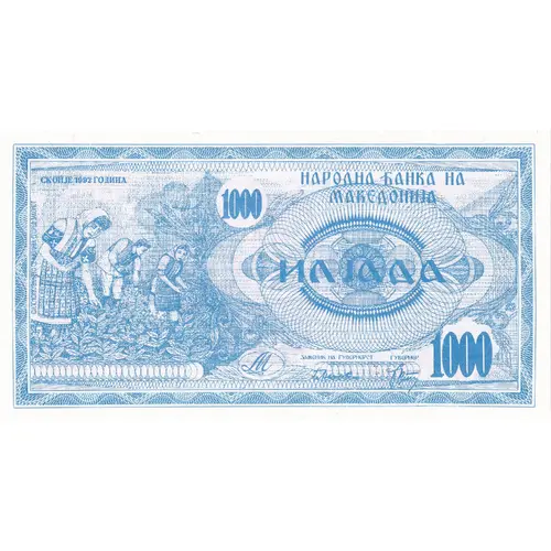 | Reverse lettering | РЕПУБЛИКА МАКЕДОНИЈА 1000 ИЛЈАДА (Translation: Republic of Macedonia, One Thousand) |