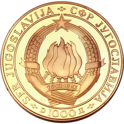 | Opis líce | SFR JUGOSLAVIJA ❖ СФР ЈУГОСЛАВИЈА ❖ D 1000 Д ❖ (Translation: Socialist Federal Republic of Yugoslavia 1000 Dinars) |