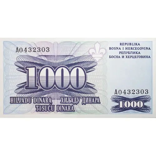 | Chữ khắc mặt trước | REPUBLIKA BOSNA I HERCEGOVINA РЕПУБЛИКА БОСНА И ХЕРЦЕГОВИНА HILJADU DINARA ХИЉАДУ ДИНАРА TISUĆU DINARA (Translation: Republic of Bosnia and Herzegovina (in two languages) Thousand Dinara (in two languages and two scripts, Latinic and Cyrillic)) |