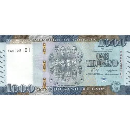Obverse lettering ONE THOUSAND DOLLARS CENTRAL BANK OF LIBERIA 1000 THIS CENTRAL BANK NOTE IS LEGAL TENDER FOR ONE THOUSAND LIBERIAN DOLLARS 1000 ONE THOUSAND DOLLARS