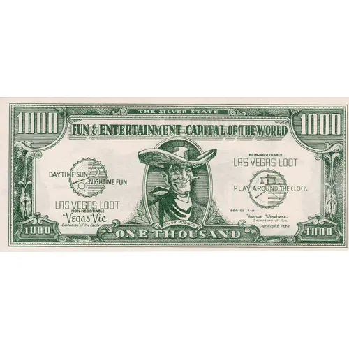| Obverse lettering | THE SILVER STATE FUN & ENTERTAINMENT CAPITAL OF THE WORLD $1000 NON-NEGOTIABLE LAS VEGAS LOOT DAYTIME SUN NIGHTIME FUN PLAY AROUND THE CLOCK SERIES 7-11 Vegas Vic Custodian of the Cache Wishue Werehere Secretary of fun Copyright 1954 ONE THOUSAND |