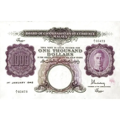| Obverse lettering | Board of Commissioners of Currency Malaya This Note is Legal Tender for One Thousand Dollars in the Straits Settlements and Malay States |