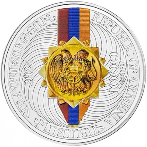 | Описание аверса | The Order of Motherland is in the center (the coat of arms of Armenia above the ribbon colored in the national flag), with inscriptions on the left and right side of the order as well as along the inner circle. The backdrop is designed as an Armenian eternity sign |