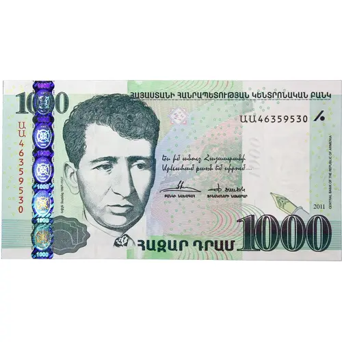 | Obverse lettering | ՀԱՅԱՍՏԱՆԻ ՀԱՆՐԱՊԵՏՈՒԹՅԱՆ ԿԵՆՏՐՈՆԱԿԱՆ ԲԱՆԿ 1000 Ես իմ անուշ Հայաստանի արևահամ բարն եմ սիրում՝ 2001 ԲԱՆԿԻ ՆԱԽԱԳԱՀ ՖԻՆԱՆՍՆԵՐԻ ՆԱԽԱՐԱՐ ՀԱԶԱՐ ԴՐԱՄ 1000 CENTRAL BANK OF THE REPUBLIC OF ARMENIA 1000 Եղիշե Շարենց 1897-1937 (Translation: CENTRAL BANK OF THE REPUBLIC OF ARMENIA 1000 I, my sweet Armenia I love the sunny bar. 2001 BANK PRESIDENT MINISTER OF FINANCE ONE THOUSAND DRAM 1000 1000 Yeghishe Charents 1897-1937) |