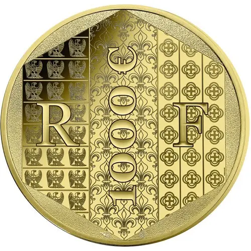 Engraved by Jean Warin, the profile of King Louis XIII comes from a 10 Louis coin currently in the collections of the Monnaie de Paris. To the left of the portrait are the monograms of Louis XIII and the heraldic symbols of royalty. The letter A refers to the mint where the original coin was minted, and was the inspiration for this creation (A= Paris). |