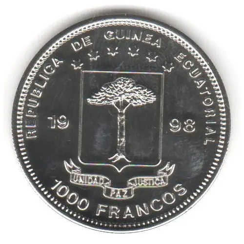 | Obverse lettering | REPUBLICA DE GUINEA ECUATORIAL 19 98 UNIDAD PAZ JUSTICA 1000 FRANCOS |