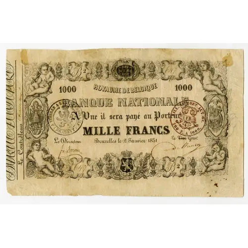 (Translation: Law of May 5, 1850 Kingdom of Belgium National Bank At sight it will be paid to the bearer One Thousand Francs Brussels, January 2nd., 1851)