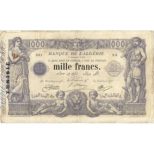 | Obverse lettering | BANQUE DE L`ALGÉRIE IL SERA PAYÉ EN ESPÈCES, A VUE, AU PORTEUR MILLE FRANCS L`ARTICLE 139 DU CODE PENAL PUNIT DES TRAVAUX FORCES A PERPETUITÉ LE CONTREFACTEUR TUNISIE JH-CABASSON, INV ET DEL. CH - J. ROBERT SC. |