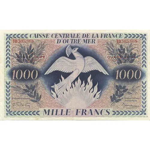 | Obverse description | Blue on red underprint. Phoenix rising from flames at center. Red overprinted GUADELOUPE twice on P#19 from French Equatorial Africa. |