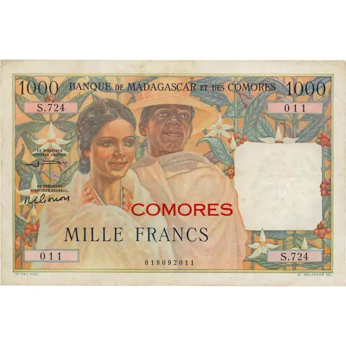 BANQUE DE MADAGASCAR ET DES COMORES MILLE FRANCS COMORES W. FEL FEC. G. BELTRAND SC. (Translation: BANK OF MADAGASCAR AND COMORO ONE THOUSAND FRANCS COMORO) |