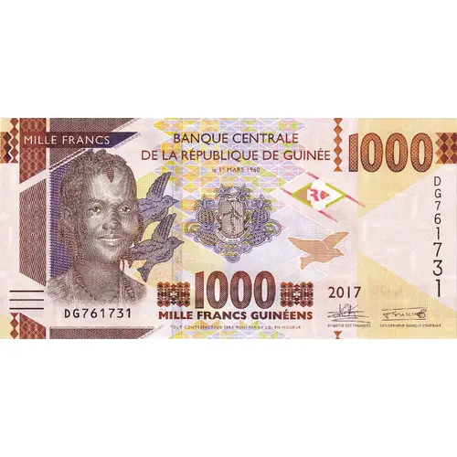 | 裏面の銘文 | Mille Francs Guinéens. Banque Centrale de la République de Guinée (Translation: One thousand Guinean Francs. Central Bank of the Republic of Guinea) |