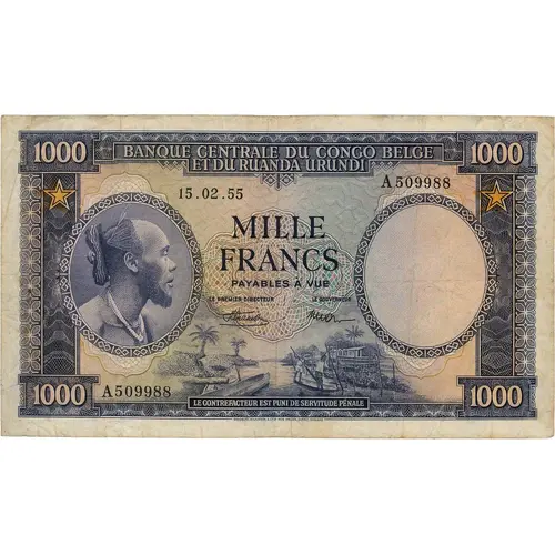 BANQUE CENTRALE DU CONGO BELGE ET DU RUANDA-URUNDI MILLE FRANCS PAYBLES A VUE LE CONTREFACTEUR EST PUNI DE SERVITUDE PENALE |
