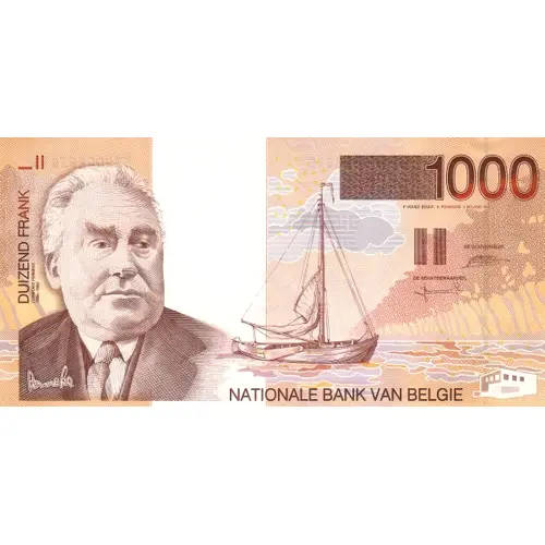 | Leyenda del anverso | 1000 P. VOUEZ SCULP. K. PONSAERS V. BOLAND INV. DUIZEND FRANK NATIONALE BANK VAN BELGIE (Translation: One Thousand Francs National Bank of Belgium) |